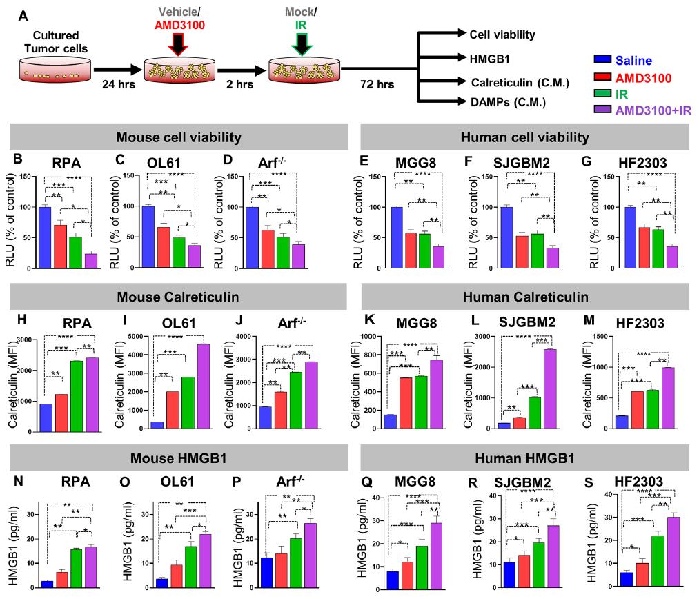 在体外小鼠和人类患者细胞系中的进一步研究表明,阻断 CXCR4 可以使 GBM 细胞对放疗诱导的免疫原性细胞死亡(ICD)敏感,从而引发抗 GBM 适应性免疫反应。
