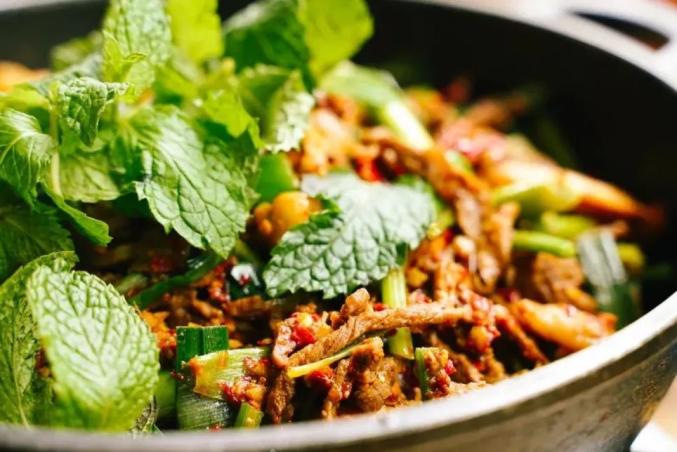 虾与辣椒发酵出的产物,叫虾酸,有接近于虾酱的浓缩海鲜气息。当充满韧性的牛肉与风味独特的虾酸相遇,一闻一看便口齿生津。鱼包韭菜