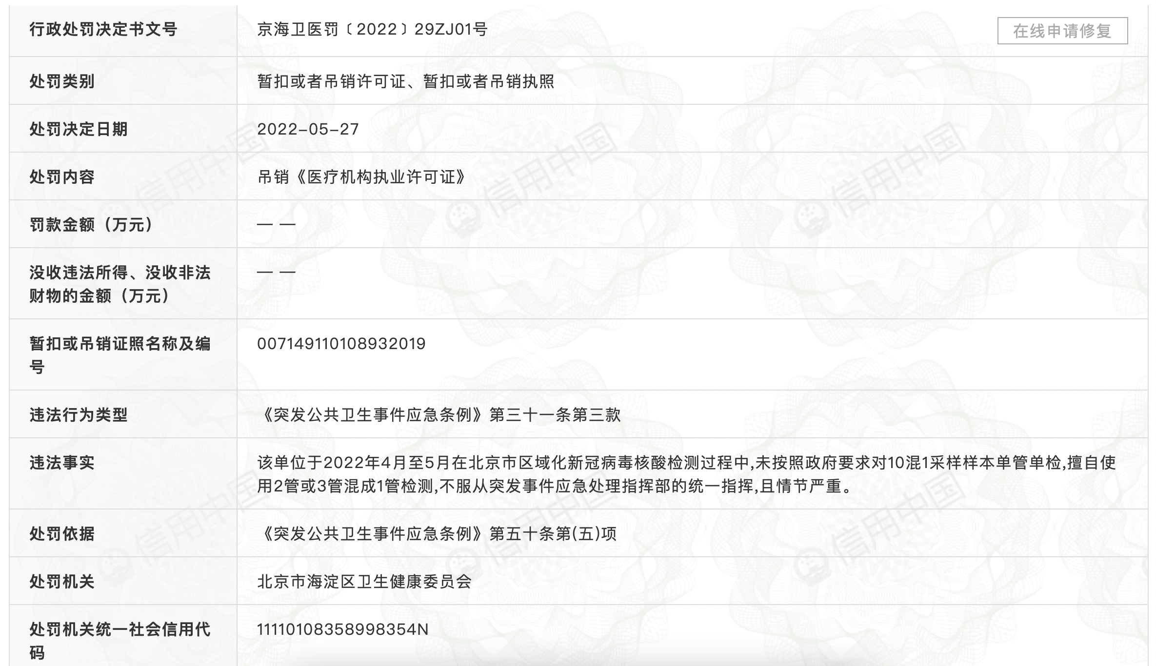 5月31日,澎湃新闻从信用中国网站获悉,北京金准医学检验实验室有限公司(下称“金准医学”)被北京市海淀区市场监督管理局吊销《医疗机构执业许可证》。