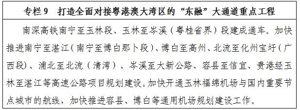 打通连接经济区各市的重要通道加快南深高铁南宁至玉林段、南宁至珠海高速公路南宁至玉林段、南宁至湛江高速公路南宁至博白那卜段建设步伐,积极对接南宁临空经济示范区,规划建设玉林连接南宁临空经济示范区的铁路货物运输通道。