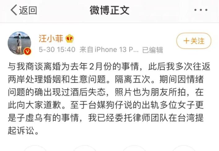 5月30日,汪小菲在微博发文详述与大S的离婚时间线,详述版以截图形式流传网络,引发热议。