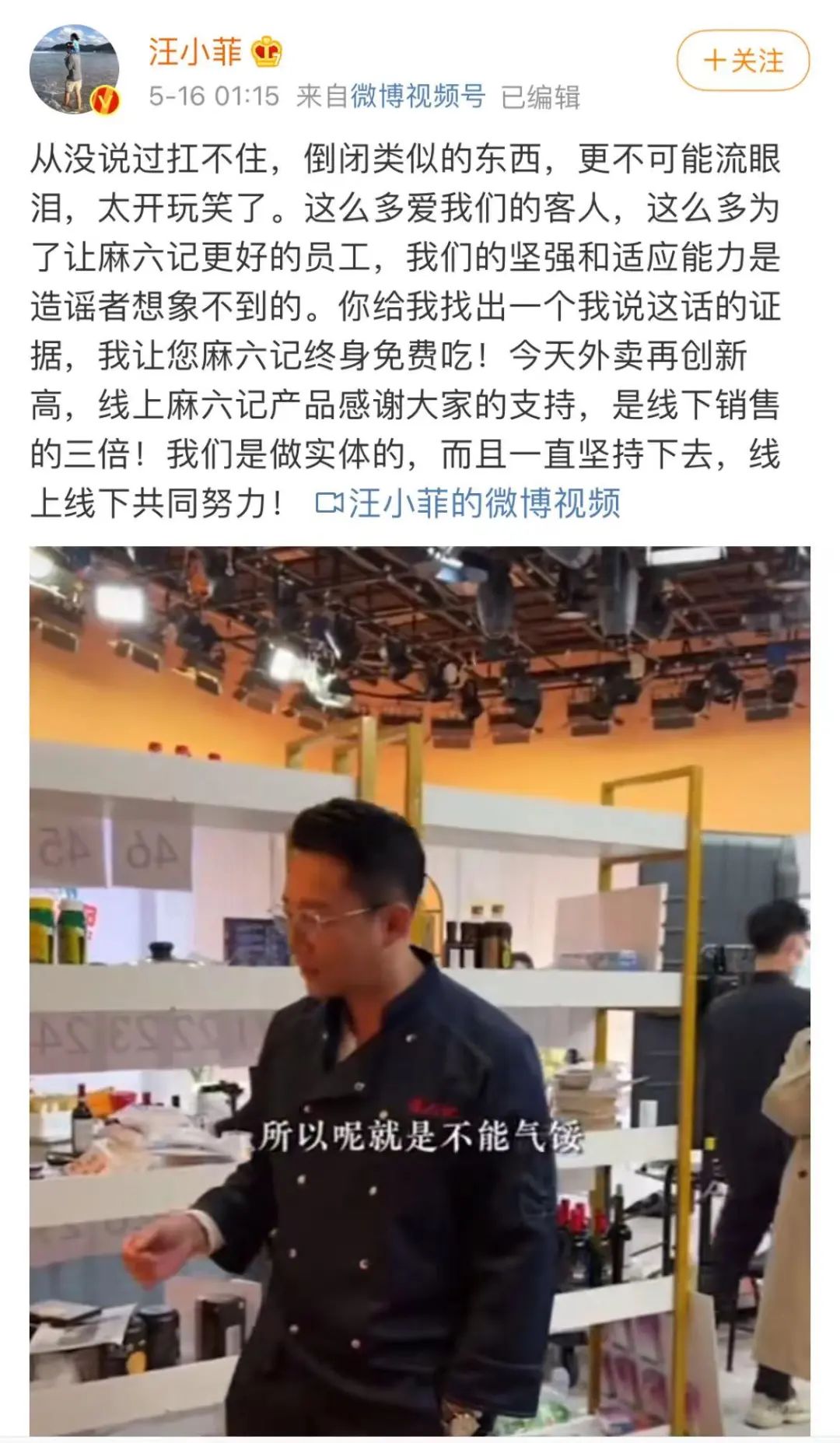 疫情之下,餐饮企业受到不小影响。麻六记也陷入破产传闻。5月16日,汪小菲微博发文称,“从没说过扛不住,倒闭类似的东西,更不可能流眼泪,太开玩笑了。”