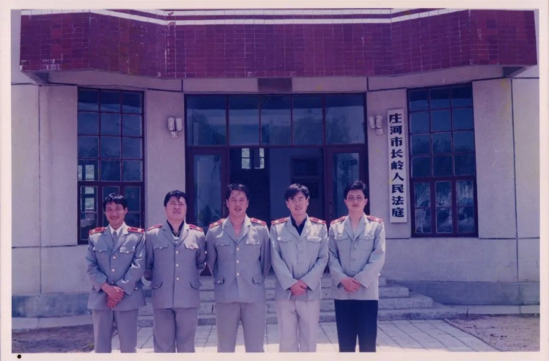 图为2000年前后在长岭法庭时全庭人员合影长岭法庭位于庄河北部山区,当时的法庭,因经费保障有限,工作条件非常艰苦,法庭所处理的案件多为村里的田间地头、家长里短的民事纠纷,跋山涉水去办案便成了家常便饭。