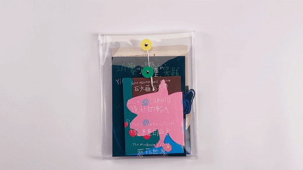 设计师黄姝是第一次做儿童书籍的设计,她把自己放到“最小”——书中设计元素均来自儿童的绘画,大部分文字也使用了孩子们的手写体。透明的文件袋里,承载着艺术实践的全部成果:耳朵书、蝴蝶书、大海报和一封学者撰写的长信。根据内容,黄姝为每一件纸制品设计了不同的打开方式和阅读方式。