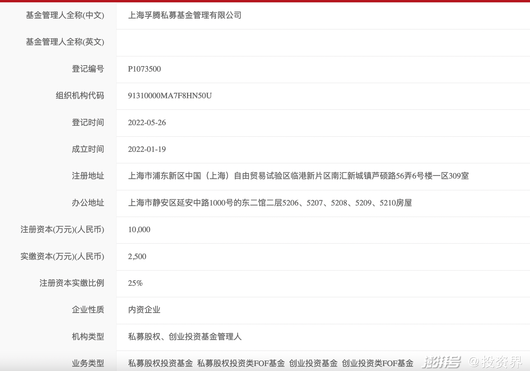 投资界--解码LP获悉,基金业协会网站信息显示,上海孚腾私募基金管理有限公司完成了备案登记,注册资本为1亿元,业务类型为私募股权投资基金、私募股权投资类FOF基金、创业投资基金、创业投资类FOF基金。