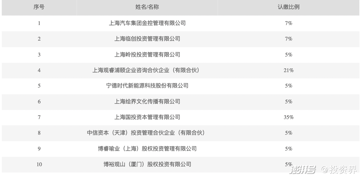 令外界惊叹的是,这个市场化母基金的出资阵容豪华——股东共有10家,包括国资背景的上海国投资本、上海临港旗下临创投资、上汽旗下上汽金控,电池巨头宁德时代、B站旗下绘界文化,中信资本、博裕资本旗下公司等。