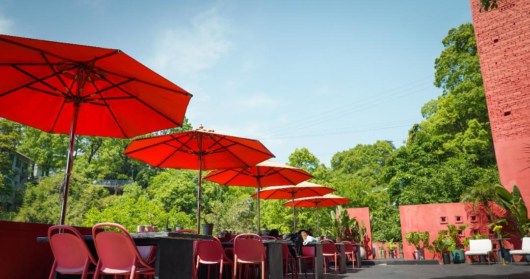 “等风来”位于一片香樟林当中,坐落在悬崖边,有着绝美的风景。“故宫红”色的现代简约建筑与群山相互辉映,处处细节都透露出用心的设计,让人过目难忘。越来越多的市民前来打卡参观,有游客评价,它是重庆版的“纪念碑谷”。