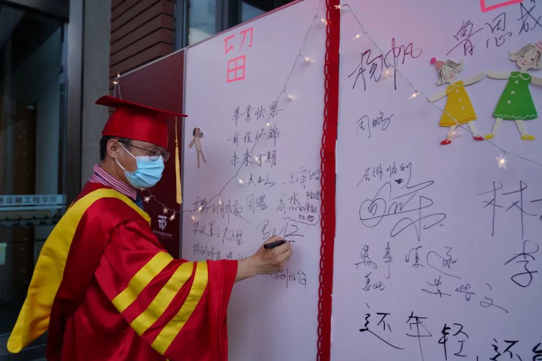 交通运输工程学院前特别布置的毕业留言墙旁,毕业生们签名留言,抒发对学校、学院的感恩之前。老师们也在此为毕业学子送上美好祝福。留言墙成为毕业生合影打卡点之一。
