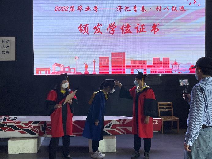 在各位老师的殷切注目下,头戴学位帽,身穿庄重的学士、硕士、博士学位服的毕业生们依次来到台前,学院党委书记程、院长为他们一一颁发学位证书和毕业证书、拨穗,与他们合影留念。毕业生代表感谢学院特殊时期为同学们精心组织的这场学位授予仪式,表示将带着这份难忘而温暖的记忆,奔赴美好前程。