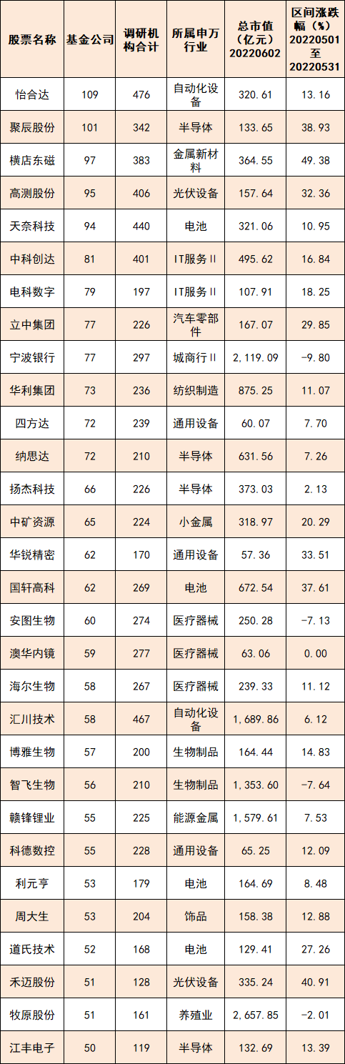怡合达不仅是5月份基金公司最关注的个股,同时也是最多机构调研的个股。同花顺iFinD数据显示,5月份共有包括109家基金公司在内的476家机构对其进行了调研。其中,不乏广发基金、汇添富基金、嘉实基金等头部基金公司的关注。
