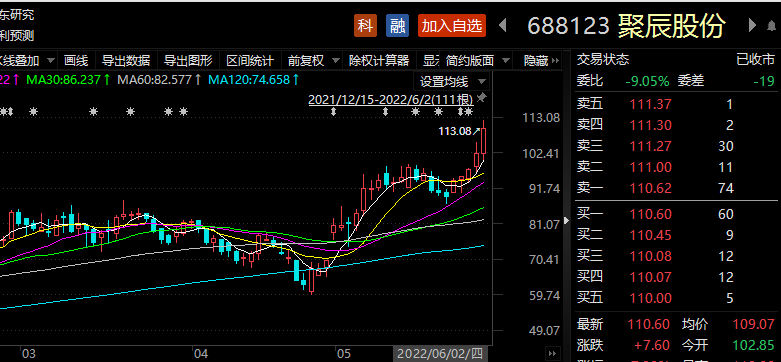 6月2日,聚辰股份收盘价为110.6元/股,当日股价上涨7.38%,总市值134亿元。5月份,聚辰股份股价上涨38.93%。聚辰股份在2022年一季度末被28只基金持仓819.26万股,占流通股比例为9.77%。