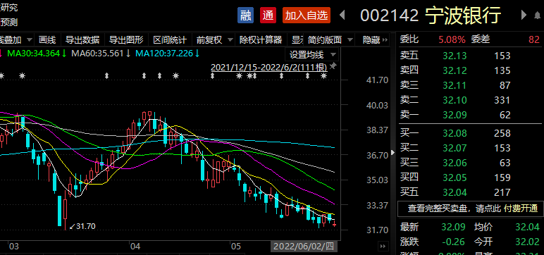 6月2日,宁波银行收盘价为32.09元/股,当日股价微跌0.8%,总市值2119亿元。5月份,宁波银行股价下跌9.8%。