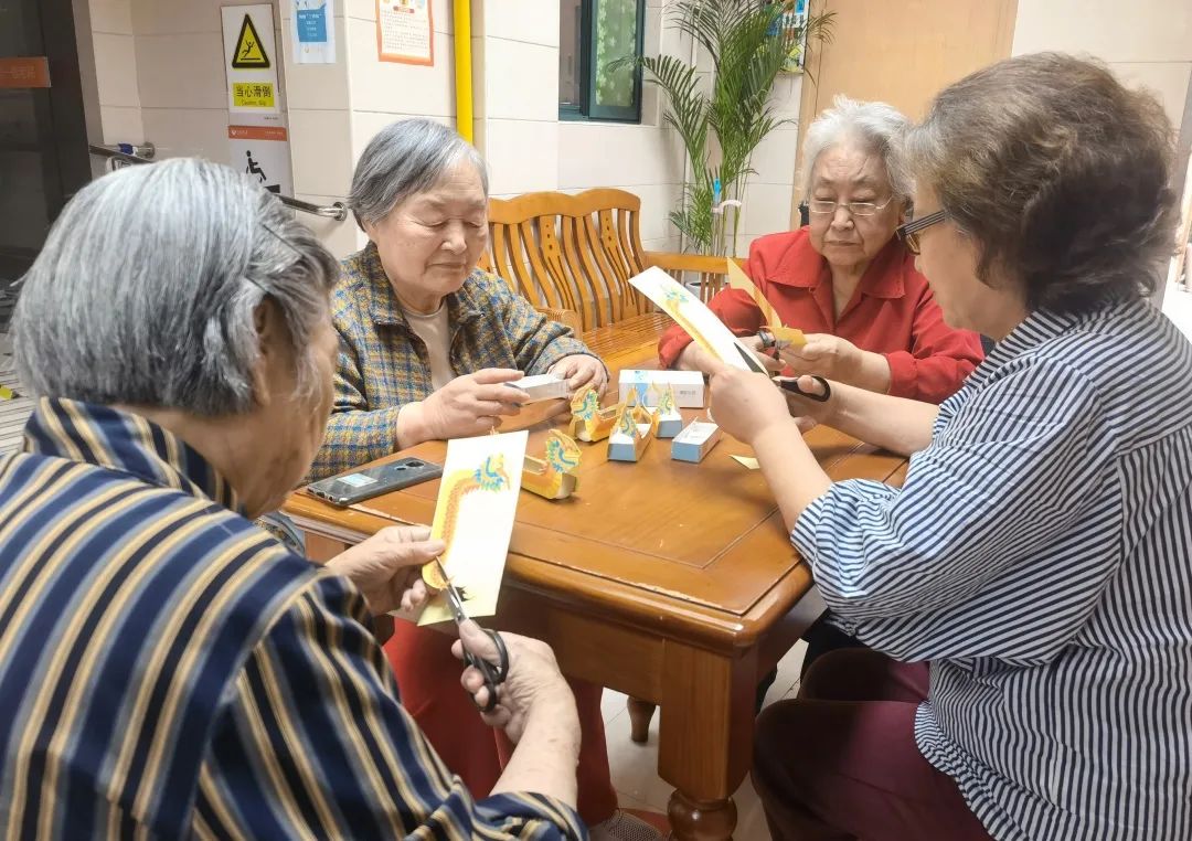 在颐养第一敬老院,部分老人们在护理员的陪伴下,手工DIY“龙舟”。船的主体是抗原试剂和消毒棉片的外包装盒,两边则是五彩的龙形图案剪纸。