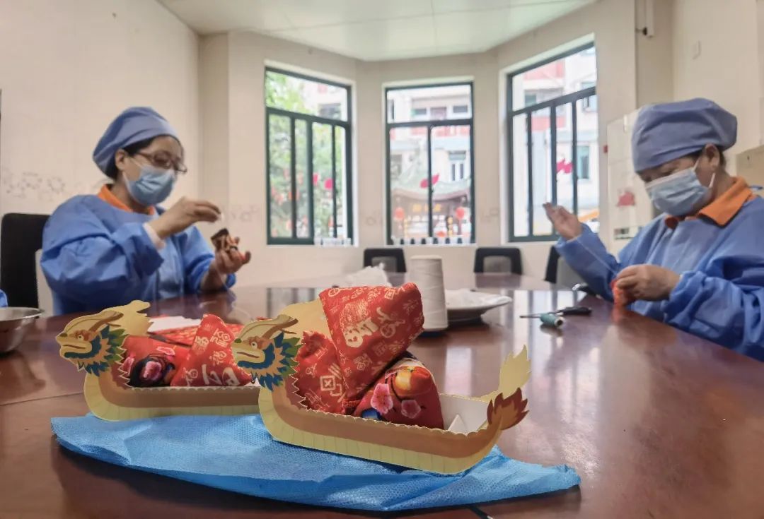 同时,部分护理员们为老人亲手缝制香囊,填充干茅根、紫苏叶、藿香以及棉花后,香囊就像一个个小粽子,很是可爱。一个个香囊放在“龙舟”上,让老人们爱不释手。