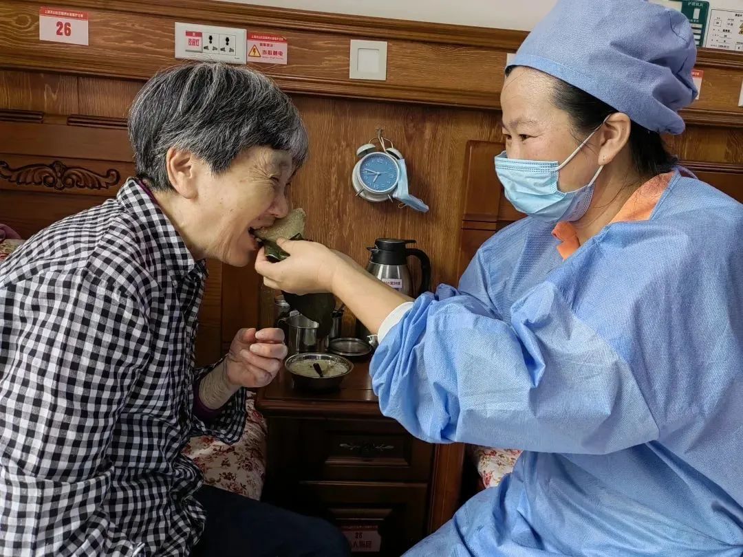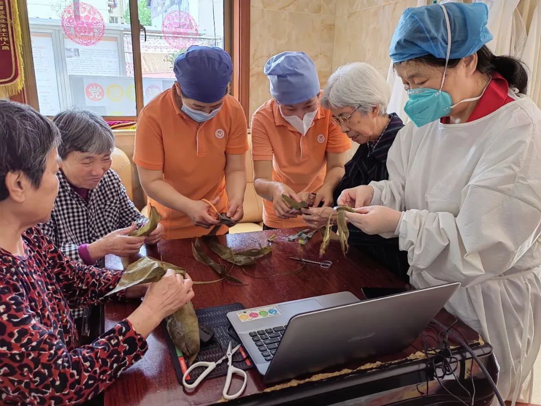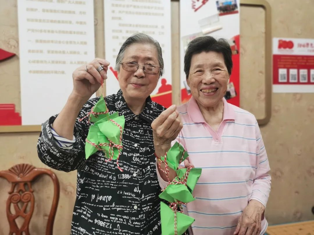 在天山社区颐养长者照护之家,护理员们一早就将老人们喜欢的粽子端入房内,一边喂老人们吃,一边叮嘱着老人:“糯米不易消化,要细嚼慢咽哦~”吃完,工作人员将剥下的粽叶洗净,就成为了老人们手工活动的原材料。跟着线上视频,老人们在护理员的陪同下,学着将粽叶折叠成了形态各异的装饰品。老人们开心地表示,“到处都飘着粽叶的香味,虽然不能出院门,过节的气氛一点都没少。”
