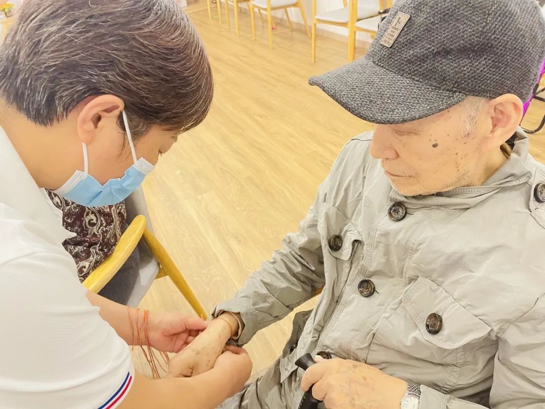 简单的几个小节目之后,护理员们为老人系上院方准备的五彩绳。“端午节系五彩绳的传统由来已久,可以驱邪避瘟。”护理员说道。