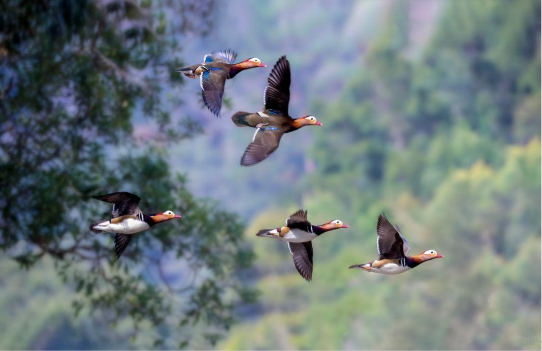 50多对来自北方的鸳鸯悠然自得地在绿水青山间嬉戏觅食