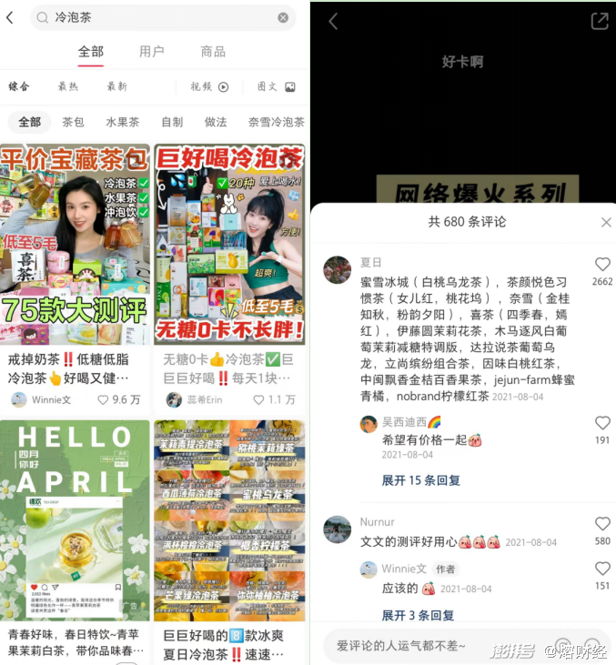 “熔财经”在小红书内看到,一位博主发布的“75款冷泡茶测评视频”点赞收藏量达到了9.6万,评论量680,视频内安利了多款新式奶茶品牌旗下冷泡茶产品,例如蜜雪冰城的“白桃乌龙茶”,茶颜悦色“习惯茶”,奈雪的茶“金知桂”“粉韵夕阳”等。