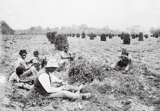 约19世纪末,美国弗吉尼亚当地获得解放的黑人正在采摘花生。16 世纪末,非洲花生随着被贩卖的奴隶来到美国,在当地得到更新和进化。19 世纪60 年代,弗吉尼亚大花生传入中国,在山东地区种植开来花生的经济价值随着品质的提升被不断地挖掘。乾隆朝进士檀萃就曾看到花生背后的巨大潜力:“(花生)今已遍于海滨诸省,利至大。今棉花种于南北,几压桑麻。若南北遍种落花生,其利益中原尤厚,故因此志而推言之。”进入19世纪,广东高州、雷州、廉州、琼州一带,花生的种植面积已经很大,用途也多种多样:既是出口海外的商品,也是礼品佳肴中的常客。到19世纪末,花生已经逐渐发展成为全国性的经济作物。1898年,德国强占胶州湾后,建设了青岛港,并在当地设置“农业改良场”,重点开展对花生品种和栽培技术的研究,使花生产量大为提高。民国时期,山东成为中国最重要的花生生产和出口省份。山东花生先是出口日本,从1908年又开始直接输入欧洲市场。