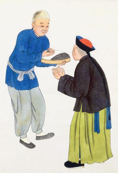 卖瓜子,出自19 世纪外销画《街头各行业人物》。据记载,葵瓜子最早被售卖是在清代,是继西瓜子、南瓜子之后出现的新品对烹饪颇有心得的中国人这回将目光又投向了葵花籽,他们将八角、薄荷、生姜、小茴香、花椒、桂皮、牛肉、 白糖、食盐、植物油等香料与精选预煮好的葵花籽再煮入味,进行烘烤、晒干后就做成了香脆可口的五香瓜子。此外,还有甜味瓜子、茶瓜子、咸味瓜子等等。清代前期,“锦州海口税务情形每年全以瓜子为要,系海船载往江浙、福建各省发卖,其税银每年约有一万两或一万数千两,或竟至二万两不等”。至清代后期,东北瓜子产销更加兴盛,为货物大宗,获利甚多。进入20世纪中叶,葵瓜子口味增多,以及更加细长好咬,果仁饱满,逐渐跃居到瓜子界的首位。