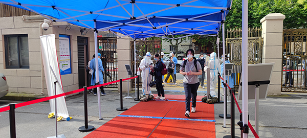 身穿校服的卢高学子们排着队,手持身份证或电子学生证,在校门口的数字哨兵上有序完成了核酸校验,再通过两侧立式的智能雾化装置对手部进行消毒清洁。