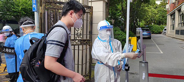 6月6日上午,伴随着晨光,身穿大白或小蓝防疫装备的教职员工们站在上海市卢湾高级中学门口,迎接已阔别了校园近三个月的学生们。