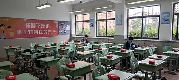 卢湾高级中学学生进入教室,教室里有学校精心准备的红色防疫礼包见面礼。
