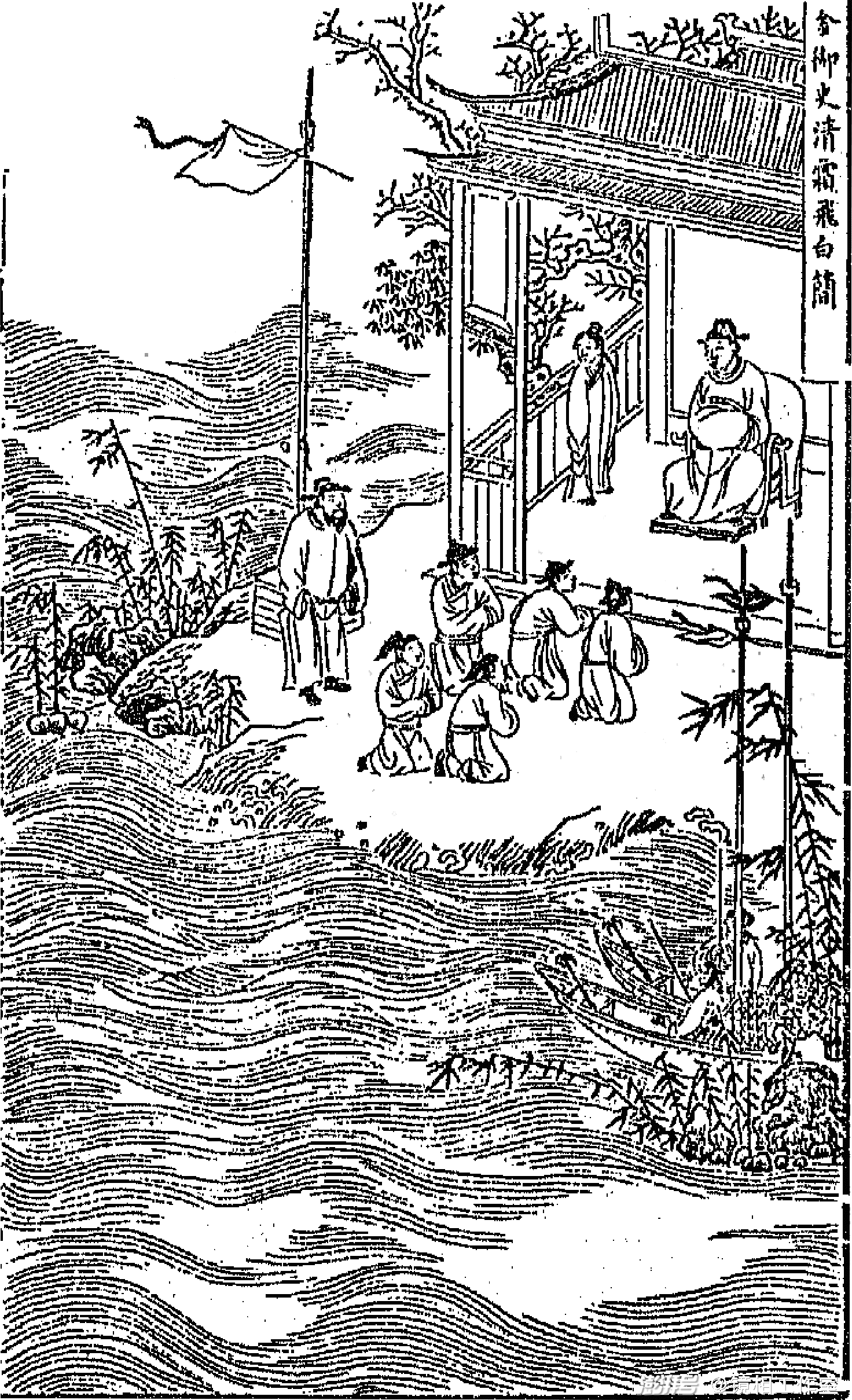 从历史图像来看,元明时期的人诉讼于公堂,是需要下跪的。在明刻本《元曲选》中,《安秀才花柳成花烛》一文附有民事诉 讼的插图,《金御史清霜飞白简》附有刑事审讯的插图,我们从 这些插图可以看到,不管是民事还是刑事,涉讼之人都得跪着 听审。