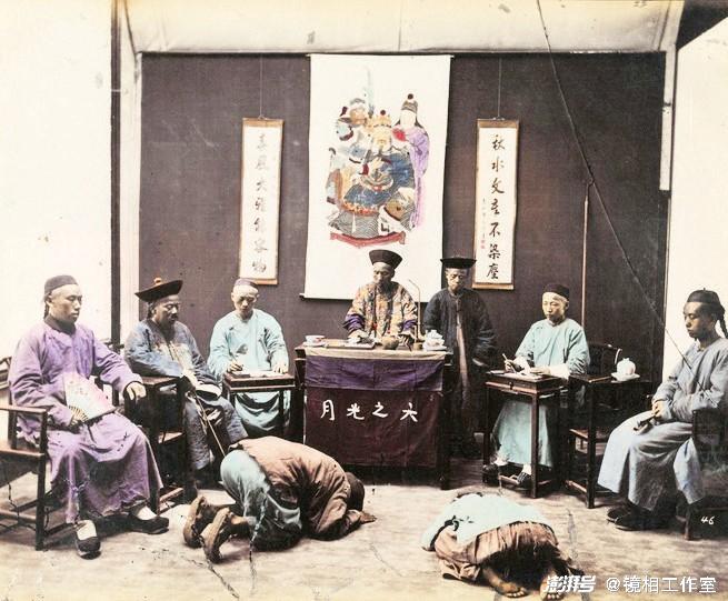 (William Saunders)是一位来自英国的商业摄影师,他曾设计场景并雇用模特摆布拍摄了一组反映晚清社会习俗的照片,如下面这幅作品《法堂》,摄于 19 世纪 70 年代,也是布景摆拍,不过反映的却是真实的清代司法常见场景。我们可以看到,在清代的公堂上,受审者是跪伏着的。