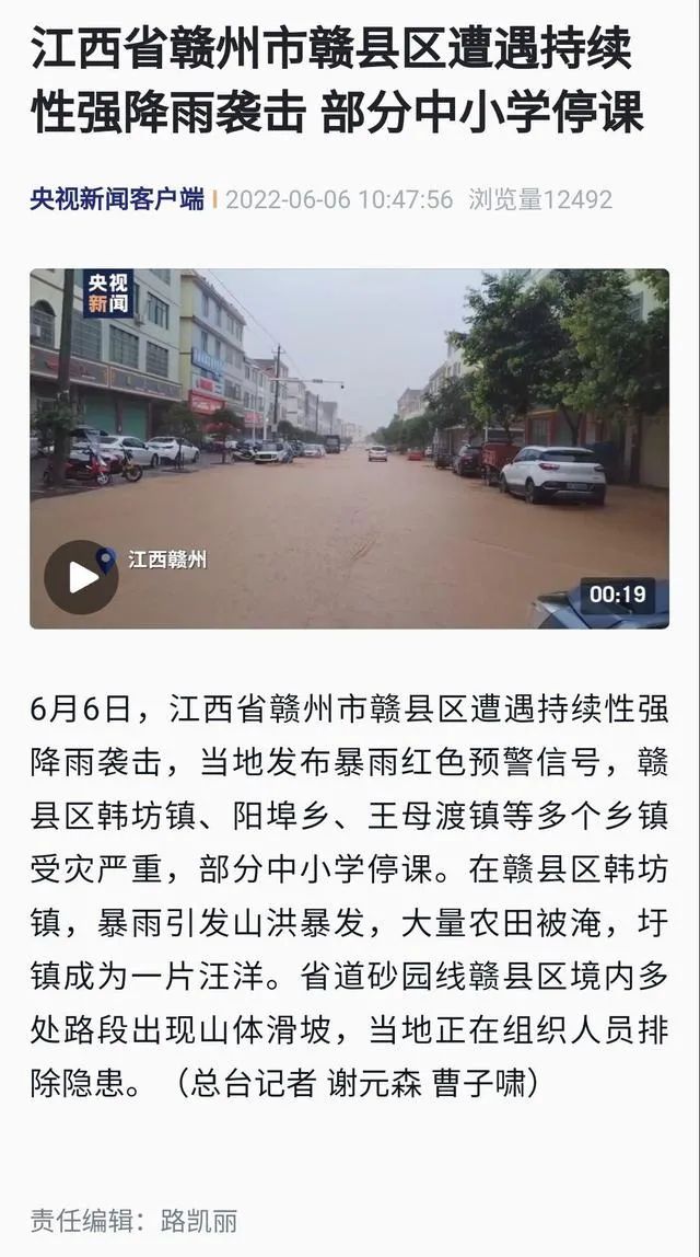 6月6日,江西省赣州市赣县区遭遇持续性强降雨袭击,当地发布暴雨红色预警信号,赣县区韩坊镇、阳埠乡、王母渡镇等多个乡镇受灾严重,部分中小学停课。