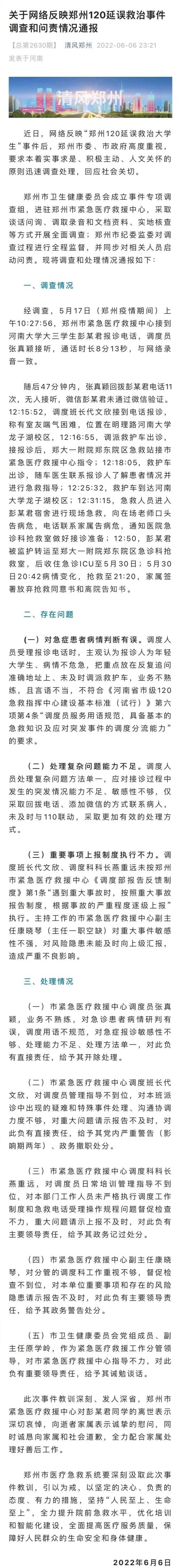 ▲6日晚,中共郑州市纪律检查委员会微信公众号“清风郑州”通报“郑州120延误救治大学生”事件问责情况:郑州市紧急医疗救援中心调度员张真颖被开除,另有多人被处分。详情↓↓