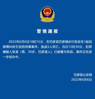 ▲ 据哈尔滨“巴彦公安”微信公众号消息,巴彦县公安局6日发布警情通报称,2022年6月6日10时15分,在巴彦县巴彦镇步行街发生1起因感情纠纷引发的刑事案件,造成3人死亡。当日12时30分,犯罪嫌疑人张某(男,30岁,巴彦县人)已被警方抓获。案件正在进一步侦办中。