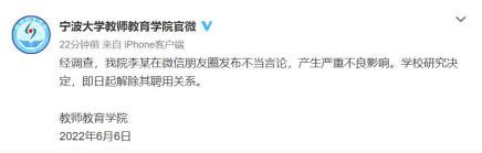 ▲近日,网传宁波大学教师教育学院一教师在朋友圈发文批评“工作中的绿茶行为”,对职场中女同事因顾孩子等原因让男同事承担额外工作量表达不满,声称“女人就是事多”,其中不乏激烈用词。对此,宁波大学教师教育学院官微6日发布情况通报称:“经调查,我院李某在微信朋友圈发布不当言论,产生严重不良影响。学校研究决定,即日起解除其聘用关系。”