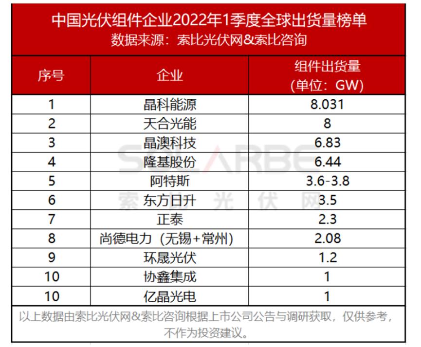 根据索比光伏数据显示,2022年光伏组件1季度出货量晶科能源斩获第一。根据上文我们也可以看出,晶科海外业务是几大巨头中占比最重的。同样地,出口占比最少的隆基股份,退出龙头位置,仅仅排名第四。