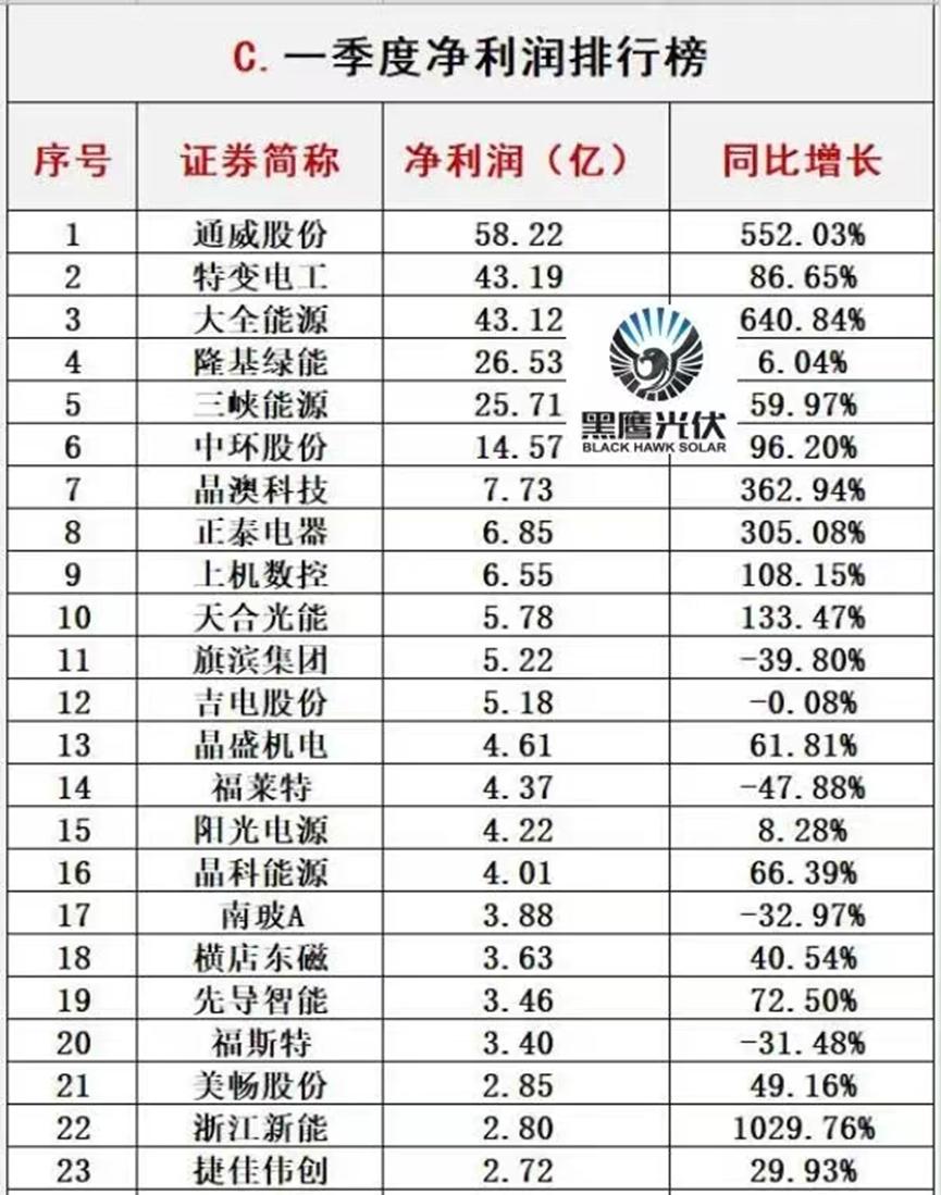 低预期产能,超预期需求根据发布的光伏一季度财报,我们发现了比较有趣的现象。比如说,硅料企业摘夺净利润三甲位置,龙头通威股份(600438.SH)登顶营收、利润双榜首。组件企业营收虽然同比上涨,但是利润却较硅料企业相距甚远。
