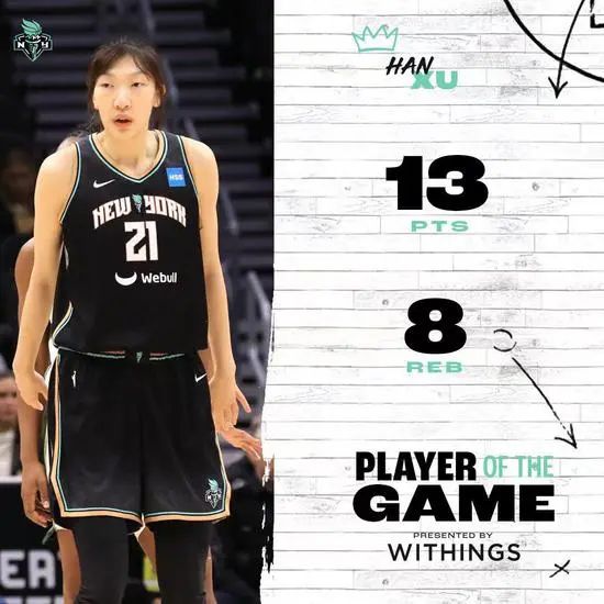 WNBA的竞技水平当然无法与NBA画等号,数据自然也是如此,考虑到这是一个每节只打10分钟,场均得分80左右而且经常出现打铁大战的联赛,韩旭本赛季的表现可以说非常了不起:50%的命中率已经是联盟前15的水平,而韩旭的效率值目前高居联盟第三,她在篮下的柔和手感,6尺10身高(WNBA历史第二)的攻防影响力,甚至在外线可以接球出手三分球的出色技术也让国外的球迷和媒体赞叹不已。