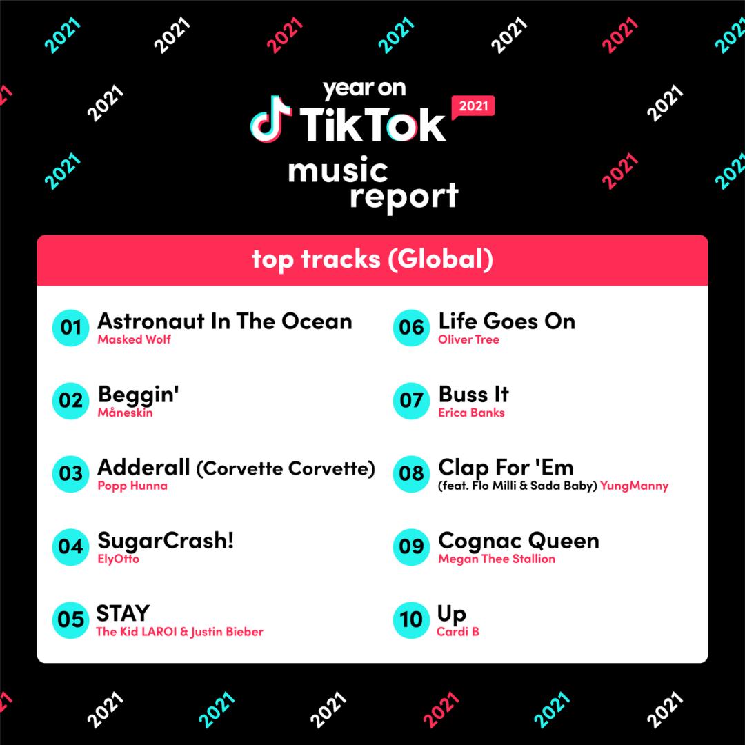 据《2021TikTok年度音乐报告》,在2021年,大约有430首歌曲的TikTok视频播放量超过10亿,比2020年增长三倍。其中,澳洲说唱歌手Masked Wolf的《Astronaut In The Ocean》是最热门的一首, 累计播放量接近200亿,令人咂舌。