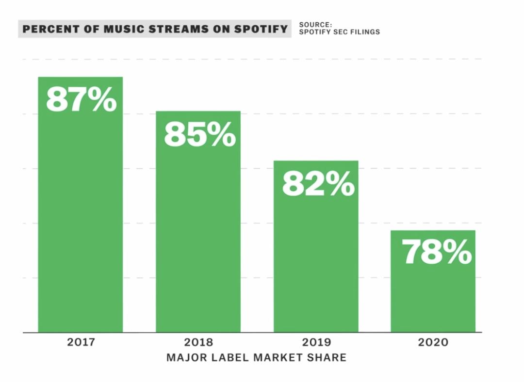 音乐流媒体公司Spotify招股书显示,在Spotify上,大唱片公司的份额逐年下降。图源:Vox视频