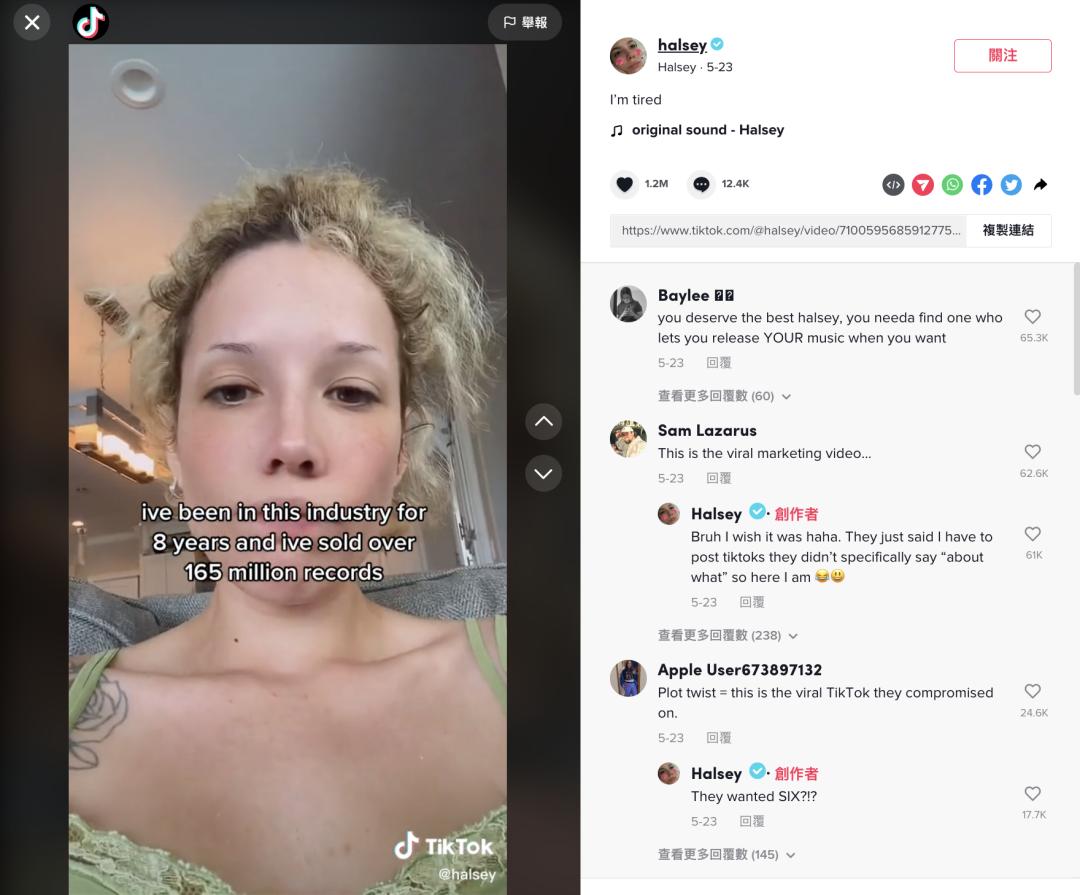 讽刺的是,Halsey吐槽视频观看量超过九百万,她和其他创作者抱怨TikTok这一事件成了热度本身,唱片公司自然满意,随后,Halsey也宣布新歌会在6月9日发布。