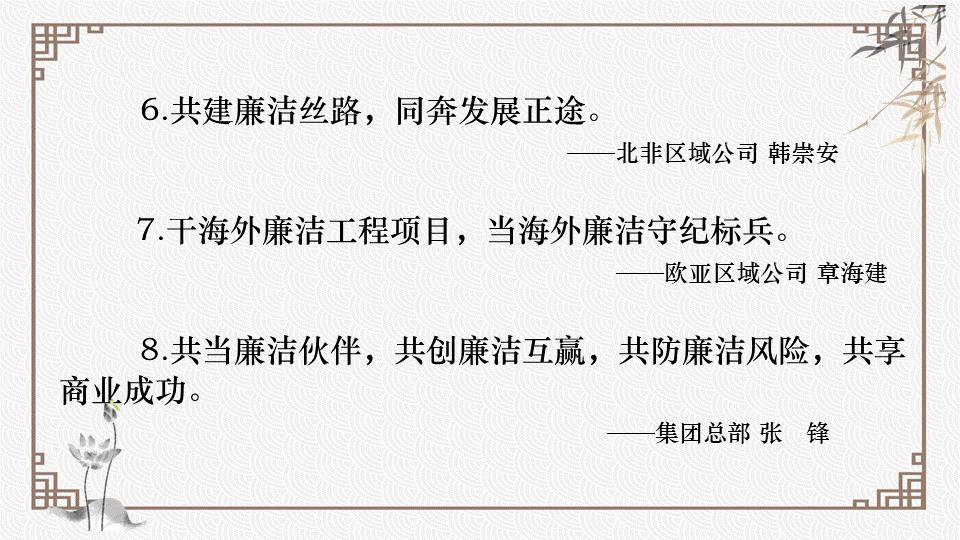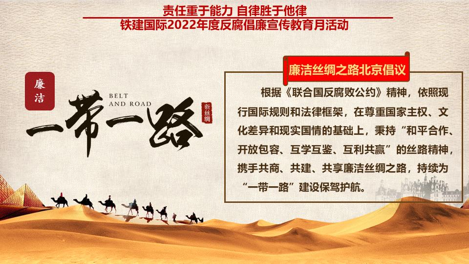 “心似莲花开,清风自然来”。为进一步弘扬“正道正行、律己律人”的企业廉洁文化理念,增强全体职工纪律规矩和担当尽责意识,五月以来,铁建国际印发《关于开展“责任重于能力 自律胜于他律”反腐倡廉宣传教育月活动的通知》和细化方案清单,及时召开动员会加强过程督导;亚太区域公司、北非区域公司、美洲区域公司、非洲事业部等单位主要领导及业务分管领导高度重视、亲自推动;各单位、相关部门在抓好疫情防控和生产经营工作的同时,层层发动、精心组织,通过“线上+线下”等多种形式,从“学先进、做榜样”、征集廉洁文化短信标语、加强警示教育等六大方面开展系列活动,积极营造浓厚的宣教氛围,有力促进了新时代廉洁文化建设。