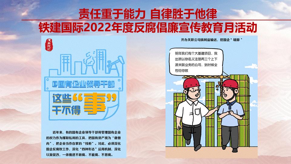 反面教育警钟长鸣铁建国际通过案件剖析、漫画说纪等形式,围绕重点领域、关键岗位,制作发布3期典型案例剖析,整理案件资源10余件,揭示“案中人”理想信念丧失、纪法底线失守的思想根源,教育引导广大职工时刻绷紧纪律弦。所属各单位组织广大职工观看《零容忍》等警示教育片,线上“云参观”廉政教育基地,加大“沉浸式”教育,促使引以为戒,筑牢思想道德防线。