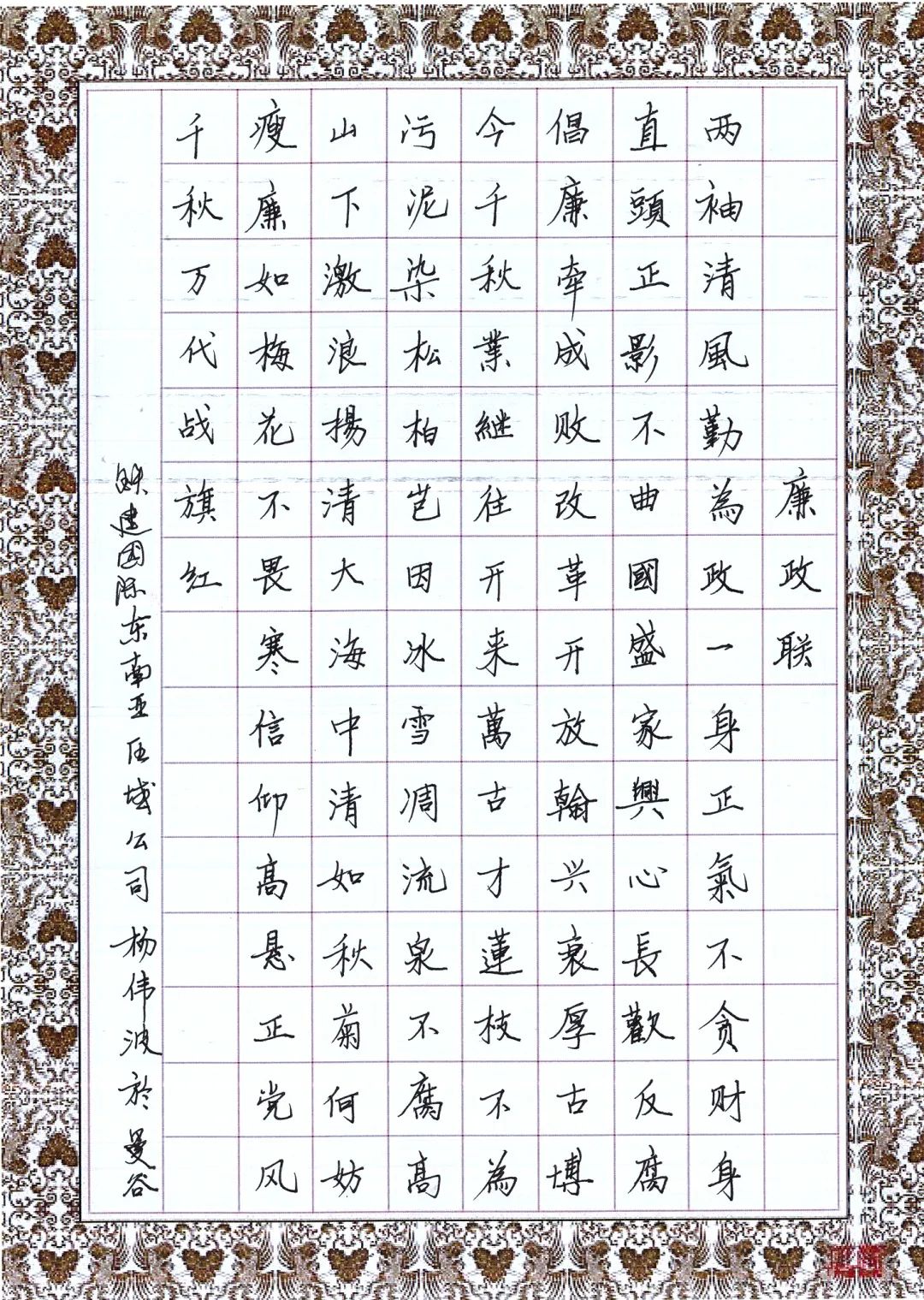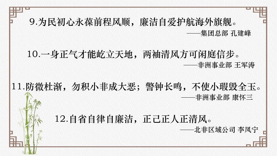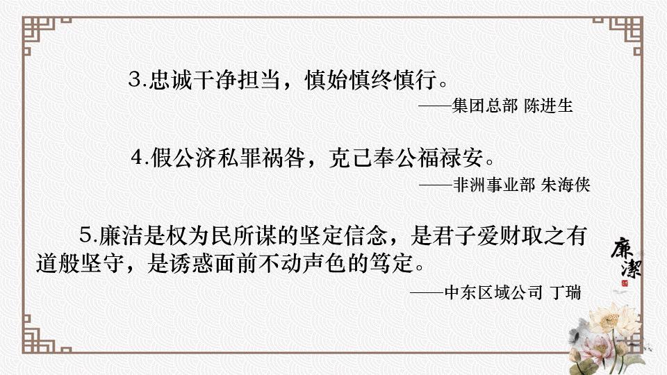 各单位动员广大职工及家属研读有关注重家庭家教家风建设重要摘编,收看家风家教纪录片,促进廉洁修身齐家。非洲事业部尼日利亚公司邀请职工家属“线上共学”《加强家庭家教家风建设》,把严管厚爱送到家;集团总部、北非、亚太等区域公司员工家属通过书法、家书等形式书写廉洁寄语,弘扬优良家风家教。