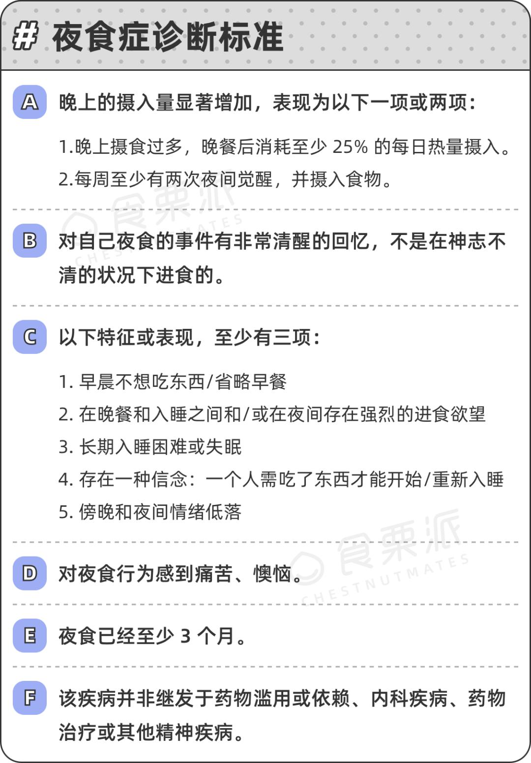 夜食症患者大约占人群的1.5%,需要医生、营养师、心理咨询师等多方面的联合帮助,才能恢复常态。如果晚上出现克制不住自己大量进食的情况,要引起注意了!建议及时寻求专业人士的帮助。