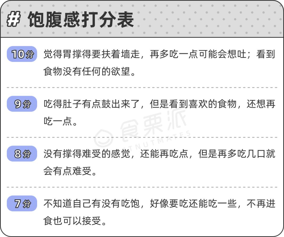 每一餐后,都可以给自己的饮食进行打分,训练对自己身体需求的感知能力。日常每一餐,吃到7/8分饱就可以了。