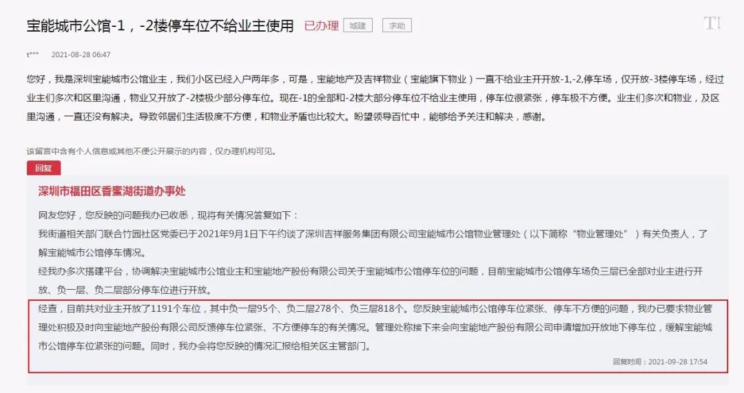 ▲宝能公馆业主投诉停车困难。来源:人民网领导留言板宝能公馆的车位纠纷由来已久。据人民网领导留言板,2021年8月,有业主反映,小区负一楼全部和负二楼大部分停车位不给业主使用,停车位很紧张,停车极不方便。之后,福田区香蜜湖街道办事处回复称,该办已要求物业管理处积极及时向开发商反馈停车位紧张、不方便停车的有关情况。物业管理处称,接下来会向开发商申请增加开放地下停车位,缓解小区停车位紧张问题。