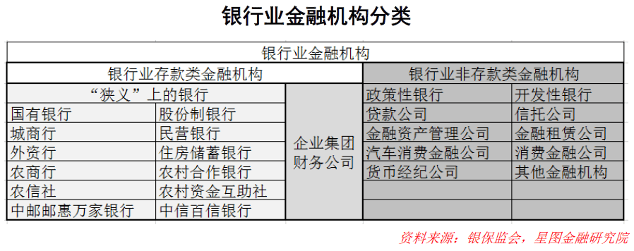 狭义上的、被公众所熟知的“银行”,具体来说应该是指银行业存款类金融机构,包括上文中提到的国有银行、股份制银行、城商行、民营银行、外资行、住房储蓄银行、农商行、农村合作银行、农信社、农村资金互助社,以及中邮邮惠万家银行、中信百信银行。而企业集团财务公司虽然也是存款类金融机构,但只能服务企业内部,也并非是一般意义公众认知中的银行。与之类似的是农村资金互助社,只能针对社员吸收存款,也与一般意义上的银行有差异。