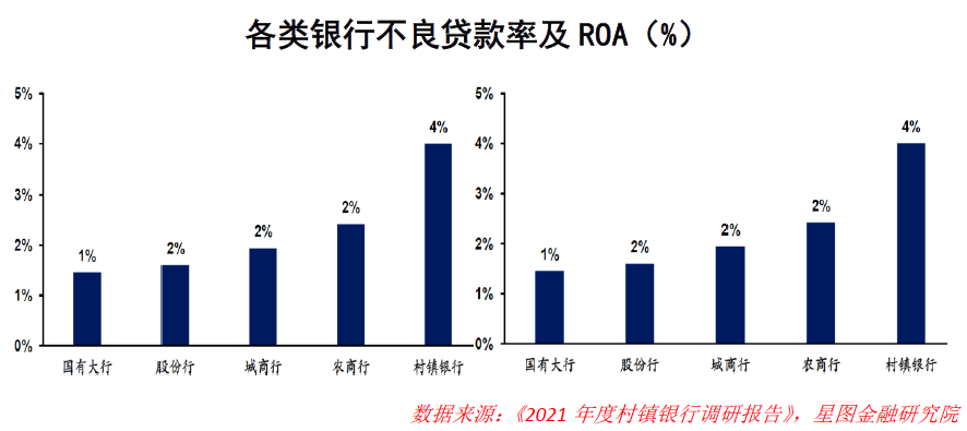 第三是地域经济风险。村镇银行立足于地方经济,发展与当地经济息息相关。村镇银行又大多数集中于经济相对落后的地区,服务的群体也是风险抵御能力更差的小微企业和普惠金融群体。在面临疫情和经济下滑的冲击时,其风险抵御能力也更差。例如像东北等经济下滑严重的地区,当地村镇银行也面临更大的经营风险。具体看数据可能更加明显,根据《2021年度村镇银行调研报告》的数据,2020年村镇银行的ROA仅有0.39%,低于其他类银行,不良贷款率4%,高于其他类银行。