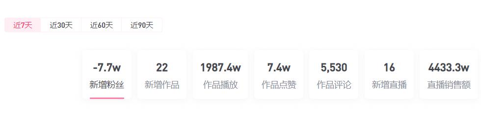 不过,没了罗老师帮忙镇场子,“交个朋友”的流量似乎有所下降。灰豚数据抖音版显示:最近7天,交个朋友直播间粉丝数减少了7.7万,为近3个月以来,粉丝数首次出现下滑。