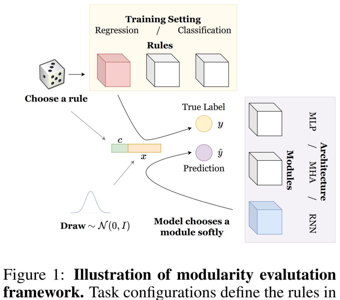 本文中,研究者探究了一系列模块化系统如何执行常见的任务,这些任务由我们称为规则数据的合成数据生成过程制定。他们介绍了关键组成部分的定义,包括(1)规则以及这些规则如何形成任务,(2)模块以及这些模块如何采用不同的模型架构,(3)专业化以及如何评估模型。详细设置如下图 1 所示。