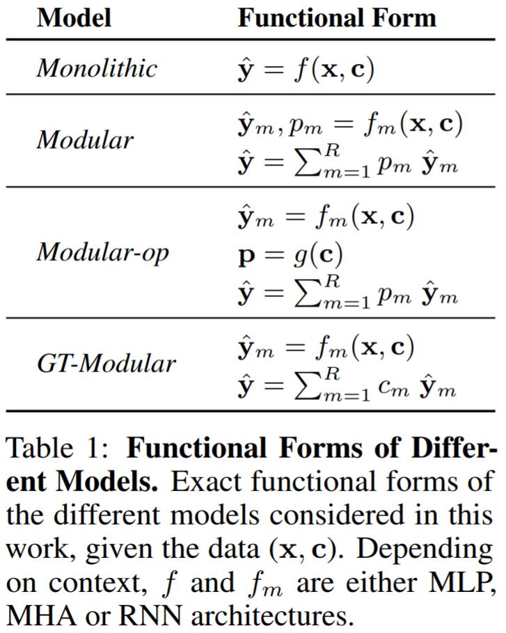 Monolithic。单体系统是一个大型神经网络,它以整体数据 (x, c) 作为输入,并依此做出预测 y^。系统中显式 baked 的模块化或稀疏性没有出现归纳偏置,并完全取决于反向传播来学习解决任务所需的任何函数形式。Modular。模块化系统由很多模块组成,每个模块都是给定架构类型(MLP、MHA 或 RNN)的神经网络。每个模块 m 将数据 (x, c) 作为输入,并计算输出 yˆ_m 和置信度分数,跨模块归一化为激活概率 p_m。